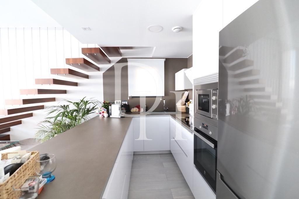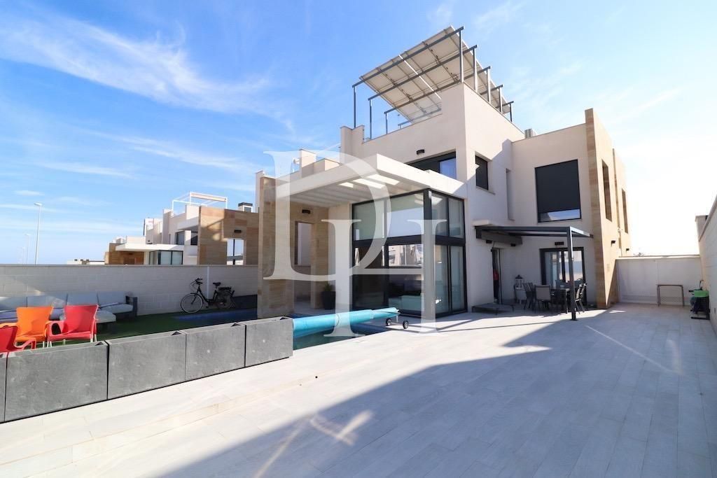 Lomas de Caboo Roig, spectacular independent villa with a large plot of 230 m2 and a house on two floors of 140 m2, has 3 bedrooms, one of them on the ground floor, and 3 bathrooms, large living room with integrated kitchen, terrace, driveway, private heated pool and a large solarium with sea views, the house is sold semi-furnished, has air conditioning and is completely energy independent, automatic awnings.