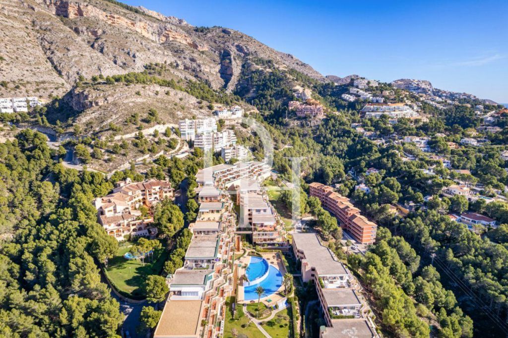 This apartment in the sought-after urbanization of Altea la Nova is situated just 1 km from the prestigious Altea Golf Club and 2 km from Altea la Vella, where all services are available. It is also 2 km from the sea. The urbanization features extensive green areas and spectacular swimming pools. The 91 m² apartment includes an entrance hall, 2 bedrooms, 2 bathrooms (one en suite), a separate kitchen with an adjoining laundry room, and a bright living room. Both the master bedroom and the living room open onto a sunny 27 m² terrace with incredible mountain and sea views, perfect for enjoying the Costa Blanca's privileged climate year-round. The property is equipped with hot/cold air conditioning and includes a garage space with a storage room.