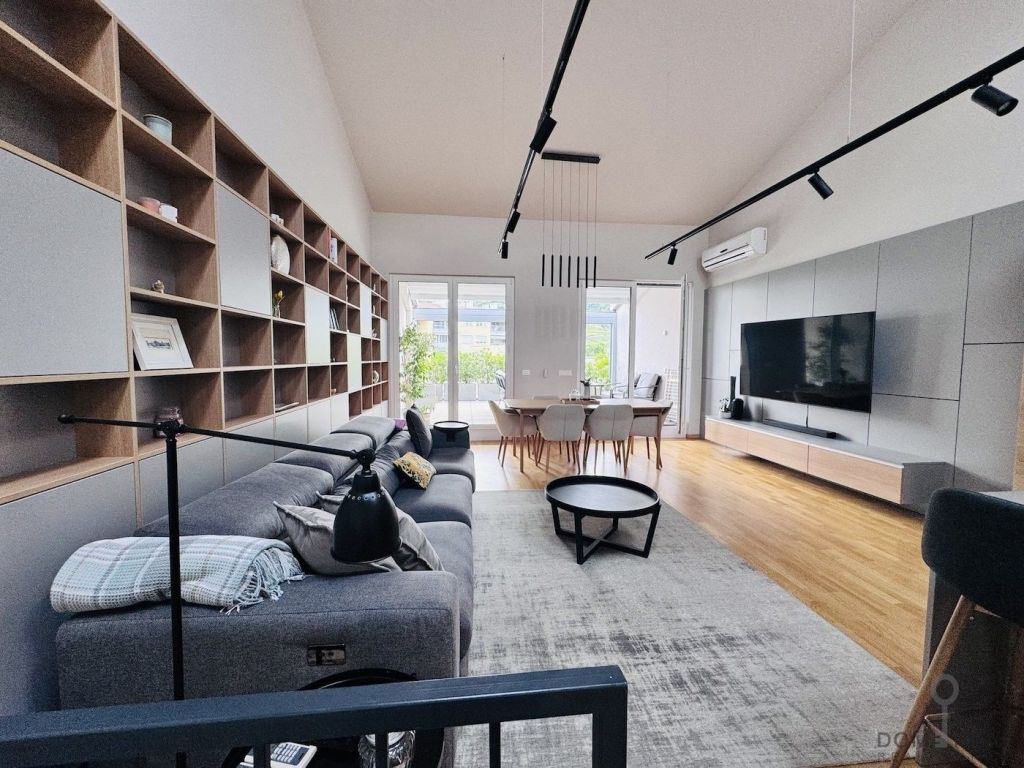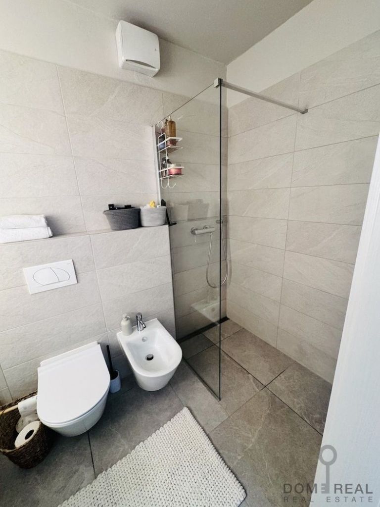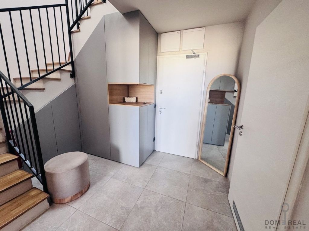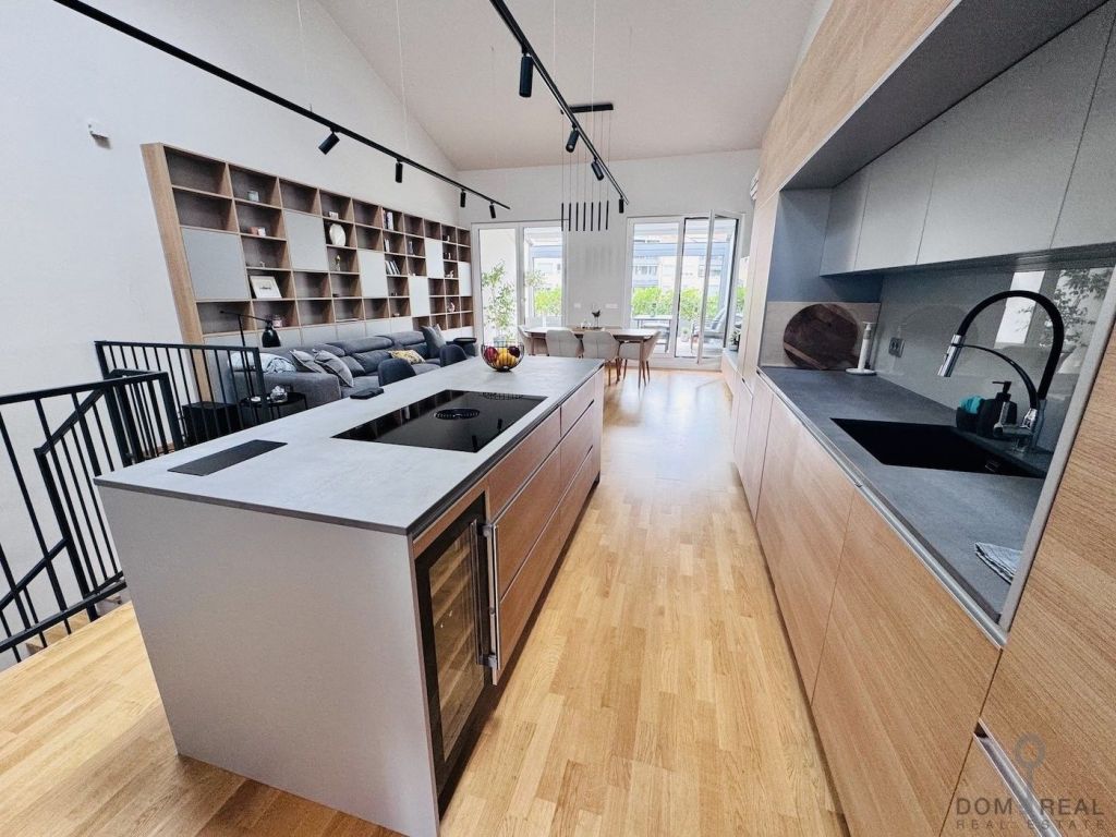 The apartment has three spacious bedrooms, well-equipped bathrooms, a storage room and two parking spaces for the owner. The interior is custom-made and designed by an interior designer, which gives the apartment a special character and a high aesthetic level. Heating is provided by a heat pump, and all rooms are equipped with air conditioning, which ensures comfortable living all year round.