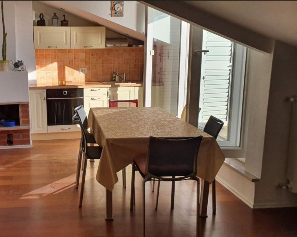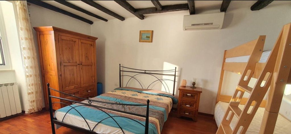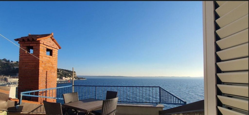The lower part of the apartment consists of an entrance hall, two bedrooms, a bathroom and a staircase leading to the attic.On the attic floor there is a living room, a kitchen-dining room and access to a terrace with views of the sea and Piran in all directions.The apartment is heated and cooled by air conditioners and radiators.The apartment will be available from September 1st.