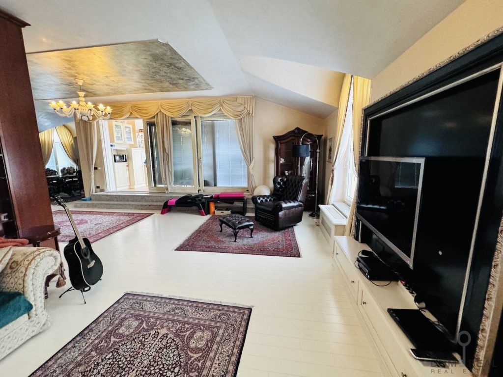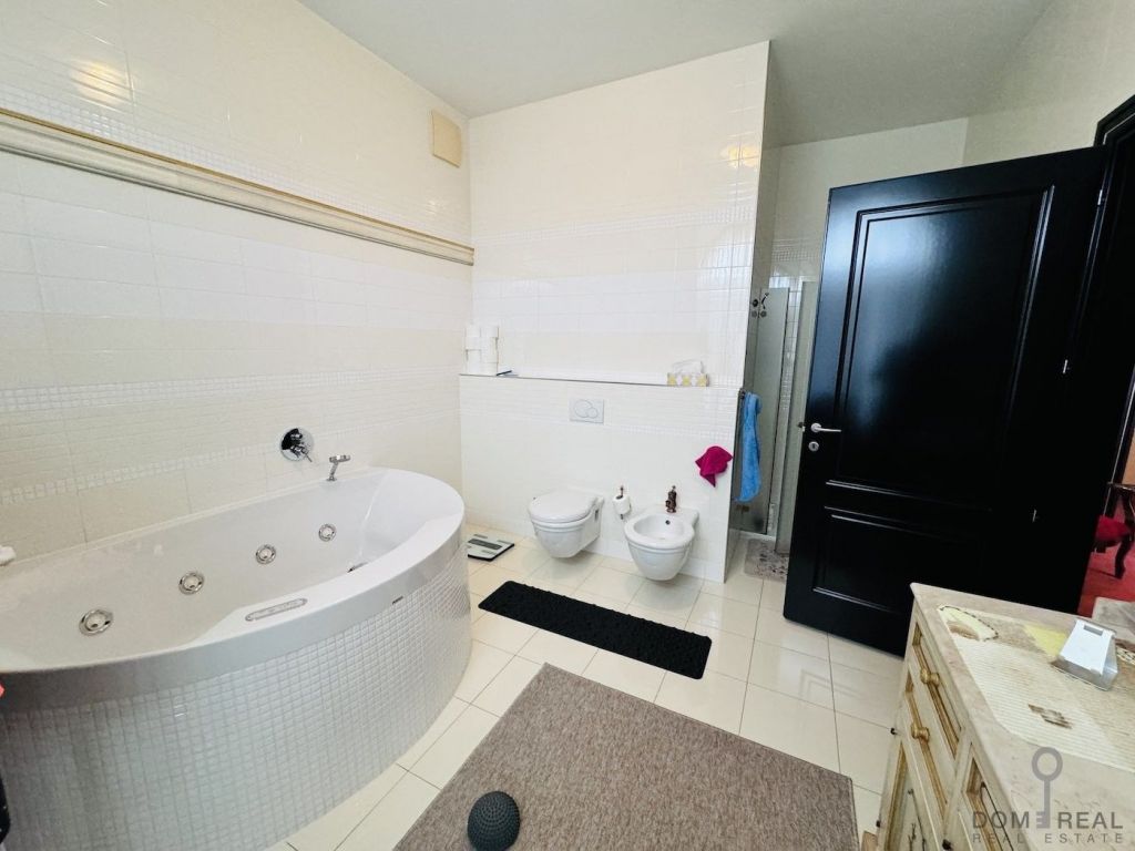 Vaulted ceilings, stucco, ceramics and parquet in the living room are in harmony with the exquisite furniture and works of art.The traditional layout with walk-through rooms includes a kitchen, a dining room with access to a large terrace, a living room, a luxurious bedroom and two children's rooms with a shared bathroom.The master bedroom enchants with its own bathroom.The modern kitchen is made of high-quality materials and equipped with high-quality appliances.The apartment is accessible by elevator.The apartment has two parking spaces in the garage and a storage room.The building is in exceptionally good condition and equipped with all communications; there is a manager.