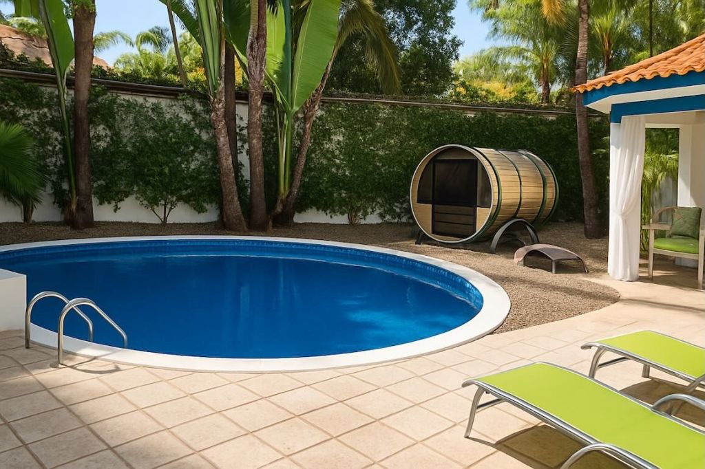 • Private plot with gates• Guest toilet with private bathroom• Master bedroom with en-suite bathroom and private bathroom• Stone floors throughout the house• Roof tiles• Outdoor kitchen and palm-roofed bar• Swimming pool surrounded by tropical vegetation• A recreation area under the roof with tiled flooring and curtains• Fruit trees and coconut palms• 24/7 video surveillance - 4 cameras• Less than 5-10 minutes to Sosua city center, beaches, restaurants and international school