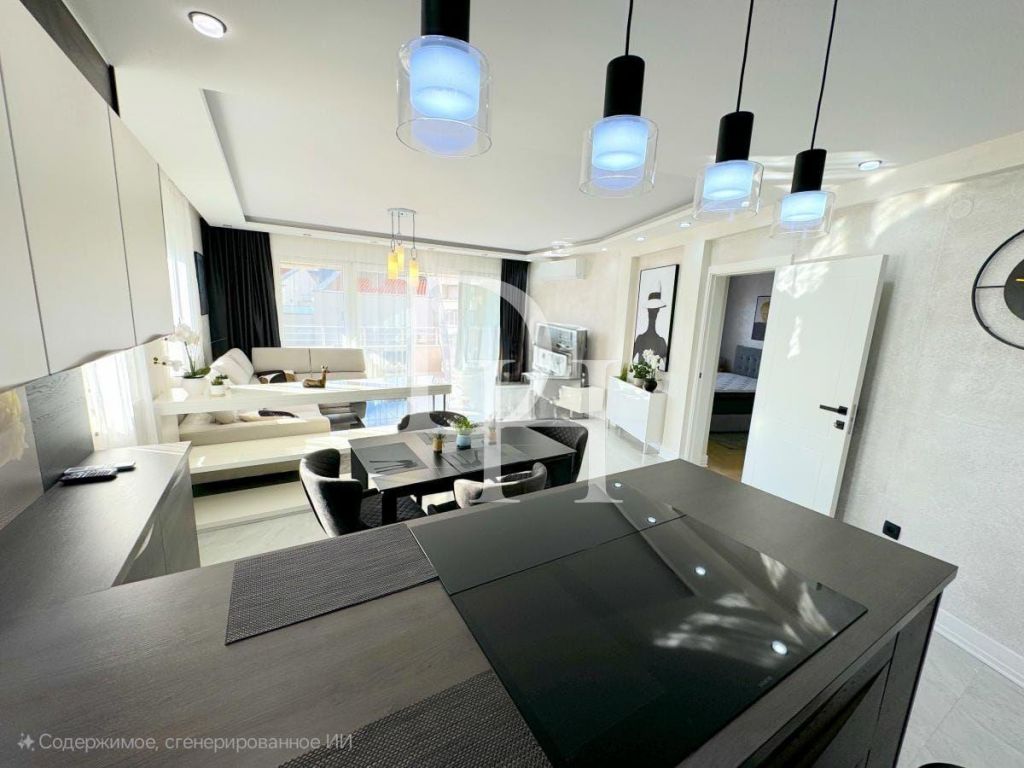 Жилая резиденция находится на втором уровне современного восьмиэтажного здания с лифтом. Общая площадь составляет 102 квадратных метра. Планировочное решение включает просторную гостиную с обеденной зоной и кухней, три спальные комнаты, две ванные, а также вместительный холл с гардеробной. С террасы открывается живописный вид на морскую гладь и горный ландшафт, создавая атмосферу уюта и спокойствия. Одна из спален имеет собственную ванную, что особенно удобно для семьи.