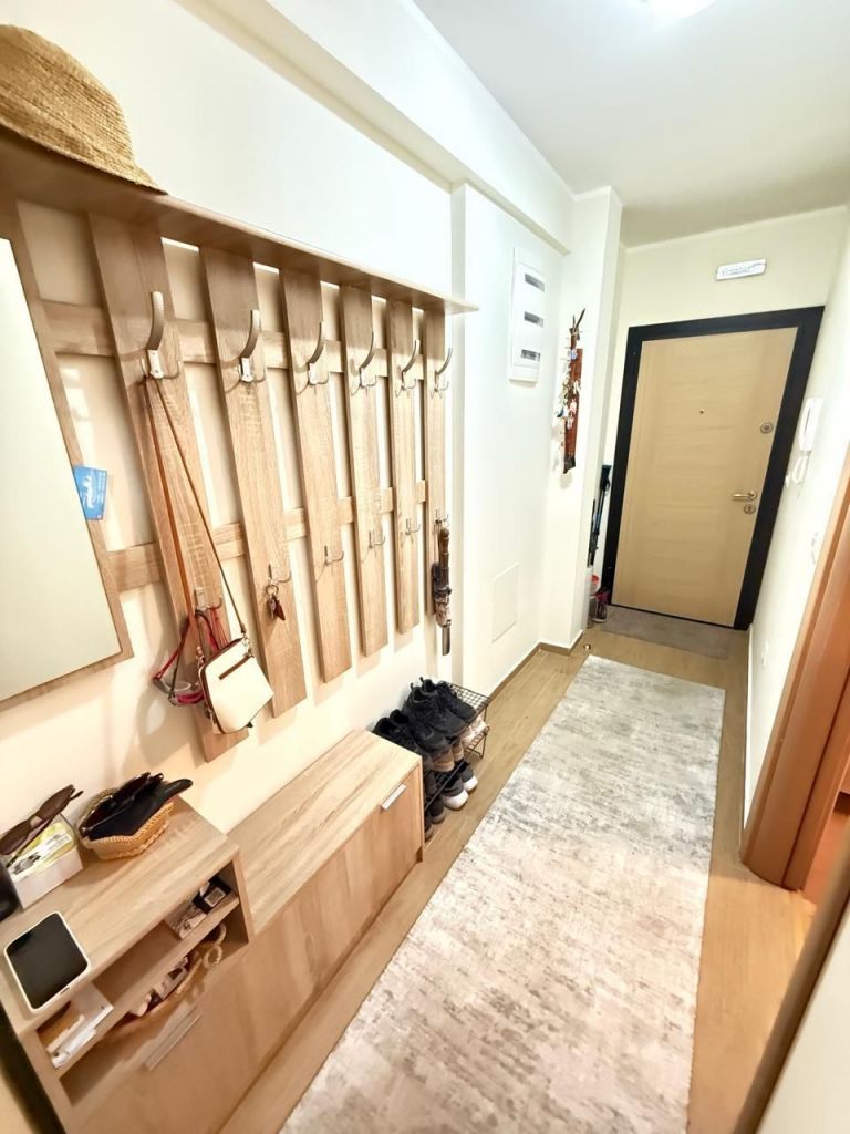 Внутренняя планировка включает гостиную, объединенную с кухонной зоной и имеющую выход на большую открытую террасу, две отдельные спальни, санузел и удобный коридор. В помещении установлены кондиционеры, а здание оборудовано современным лифтом. Объект имеет частичный вид на море, легализован и не имеет обременений. Важным преимуществом является наличие собственного гаражного места и небольшого дворика, что делает проживание особенно комфортным.
