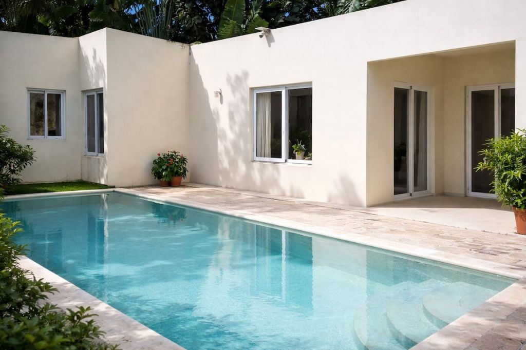 Площадь дома: 125 м² / Участок: 530 м²3 спальни, 2 ванные комнатыГостиная и столовая с видом на бассейнКухня открытой планировки, полностью оборудованаБассейн, терраса, зона BBQ, прачечная, парковкаВысокий каменный забор, зелёный газон, техническое помещение